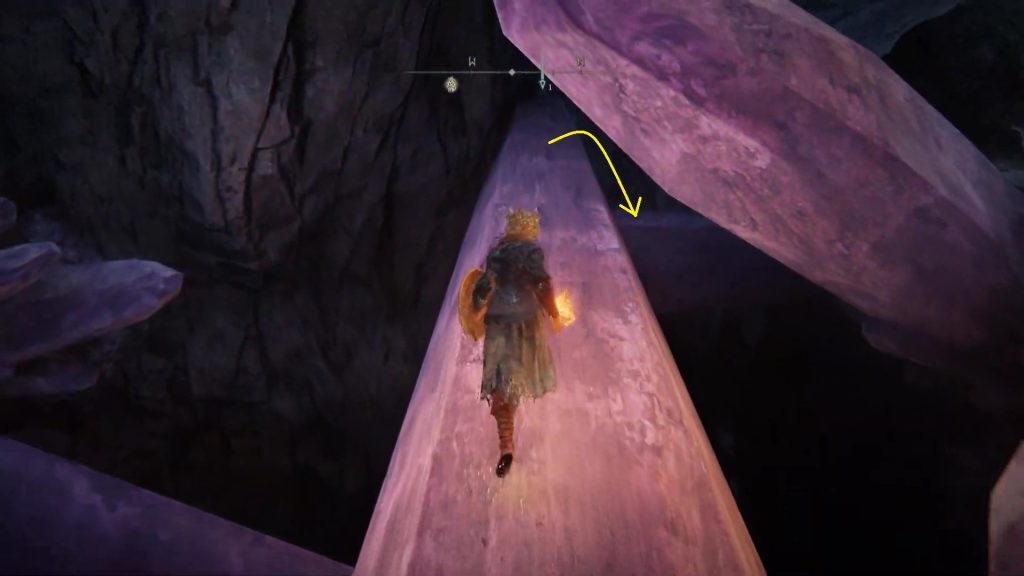동굴 안으로 들어가 동굴 끝이 환상의 벽에 부딪히면 더 먼 길을 드러냅니다. 두 개의 환상의 벽을 지나면 긴 보라색 수정이 있는 지역에 도달하게 됩니다. 여기에서 목표는 가장 낮은 수준으로 가는 것입니다. 첫 번째 수정이 끝날 때까지 걸어가서 아래와 같이 오른쪽 수정 위로 점프합니다.