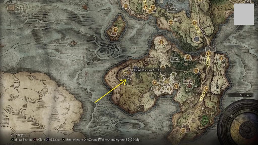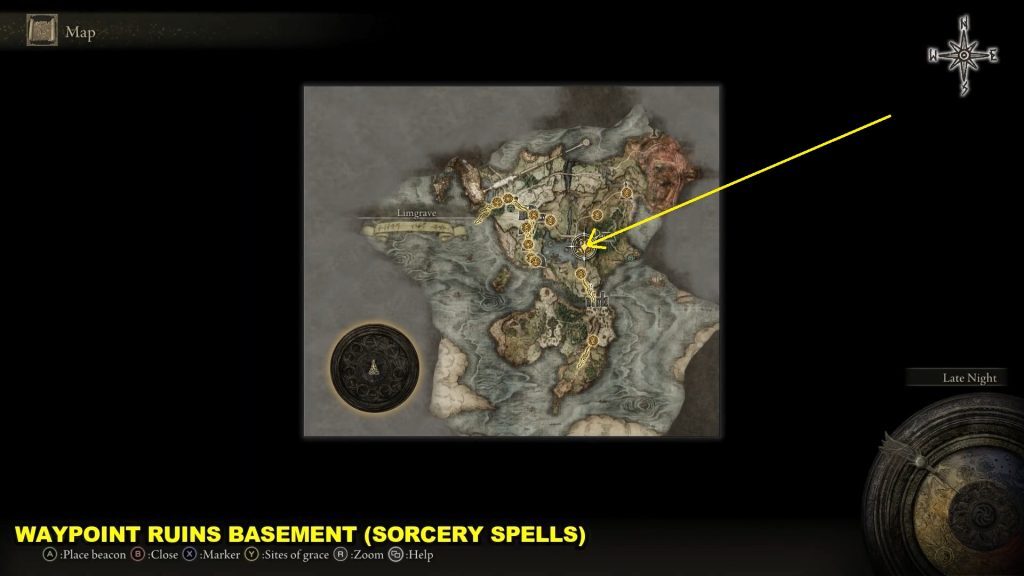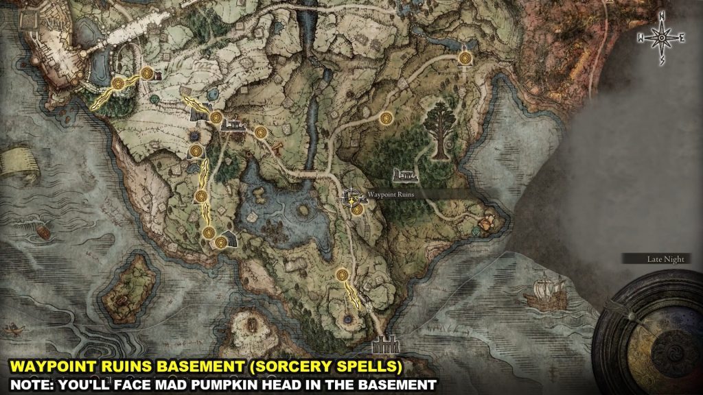 아래 그림과 같이 Limgrave 의 Waypoint Ruins 지하 로 이동 합니다. 거기에서 Mad Pumpkin Head 보스 를 물리쳐야 합니다. 보스를 처치한 후 내부로 이동하여 Sellen이라는 NPC와 대화하십시오. 그녀는 마법 주문 상인입니다. 그녀에게 마법을 배우고 싶다고 말하십시오.