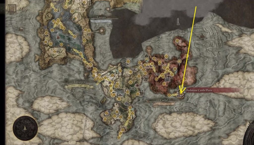 다음 단계는 아래 그림과 같이 Caelid 남쪽 가장자리 에 있는 Redmane Castle Plaza 에서 Radahn Boss를 처치해야 합니다. 라단을 처치한 후 레드메인 성 광장 북쪽에 있는 탑 안에 있는 제렌과 대화하십시오 . 그는 당신에게 그가 성을 떠날 것이라고 말할 것입니다.