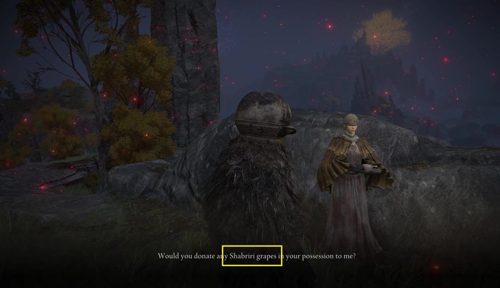 아래와 같이 리우르니아에 있는 복수자의 오두막 으로 이동 합니다. 그곳에서 은총의 자리에서 휴식을 취하면 에드워드 리벤저의 침공을 받게 될 것입니다. 그를 물리 치고 그는 Shabriri Grape를 떨어 뜨릴 것입니다. 에드워드가 침공하지 않으면 판잣집 안의 아이템을 약탈하십시오.