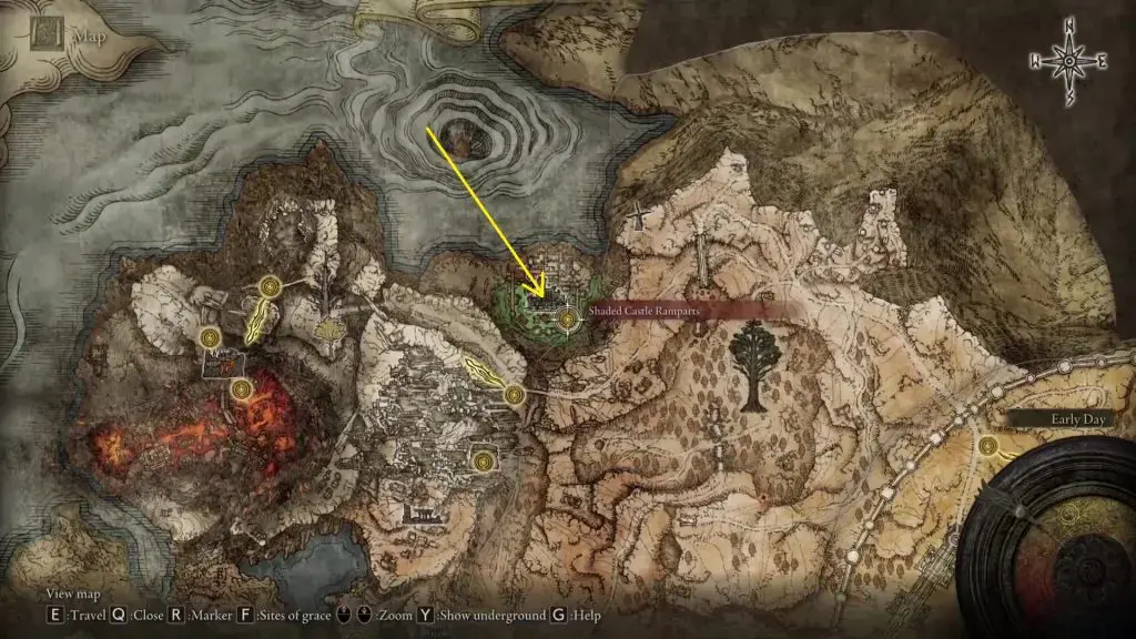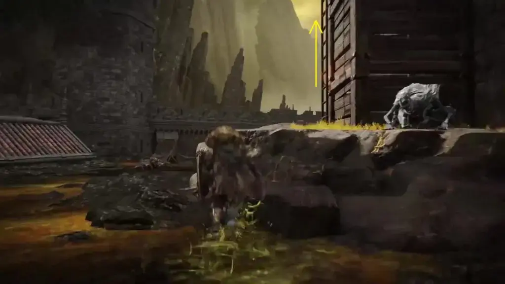 Shaded Castle Rampart Site of Grace 에서 사다리를 타고 내려가 성곽에 도달합니다. 거기에서 서쪽으로 가서 아래 그림과 같이 폐허가 된 집들이 있는 지역에서 사다리를 올라갑니다.