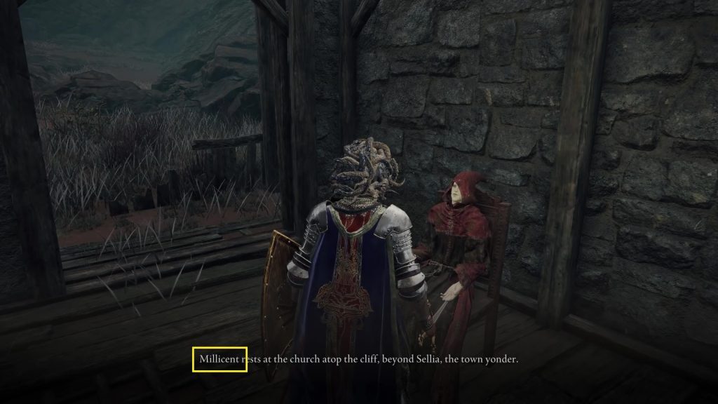 Erdtree-Gazing Hill Site of Grace 에서 북쪽으로 가면 절벽 가장자리 근처에서 그녀를 찾을 수 있습니다. Millicent와 대화하면 그녀가 Malenia가 걸어온 길을 추적하고 있다고 말할 것입니다.
