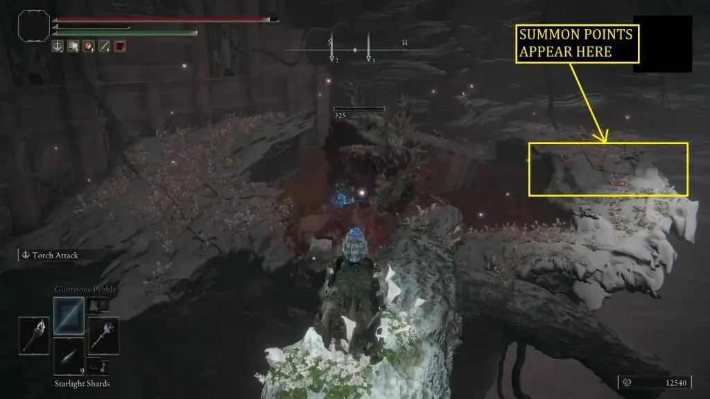 여기에서 Rot Worm 미니보스와 싸워야 합니다. 썩은 벌레를 처치하면 그림과 같이 오른쪽에 2개의 소환 포인트(빨간색 1개, 황금색 1개)가 나타납니다. 선택한 소환 지점에 따라 퀘스트에 대한 두 가지 다른 엔딩이 나타납니다.