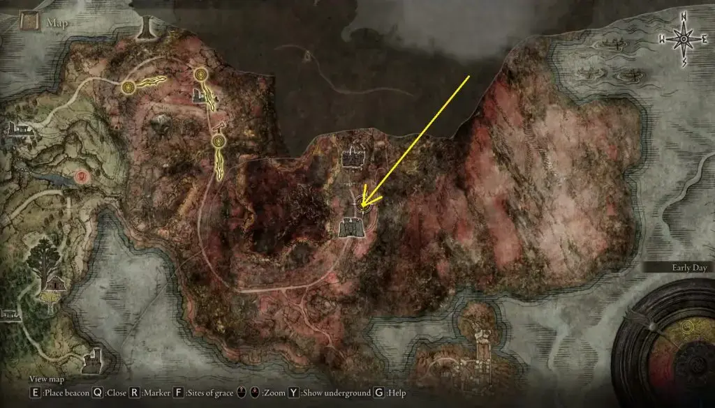 이 퀘스트 라인은 아래 사진에 표시된 위치에 있는 Caelid에 있는 Sellia Gateway 북쪽의 작은 판잣집에서 Gowry와 대화하는 것으로 시작됩니다 .
