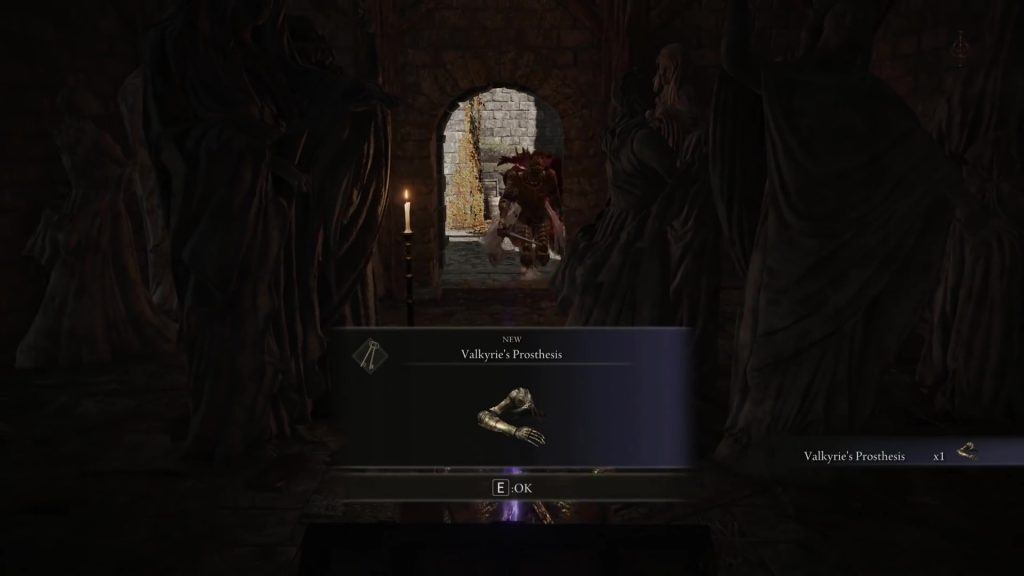 다음 단계는 Valkyrie's Prosthesis 를 찾는 것 입니다. 아래 사진과 같이 그늘진 성의 북서쪽에 있는 방 안에서 찾을 수 있습니다.