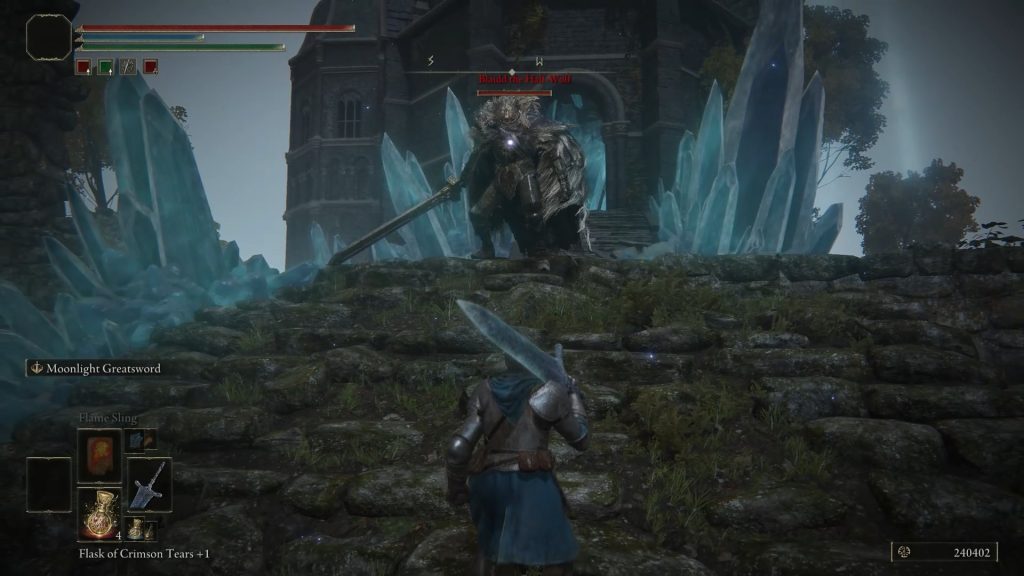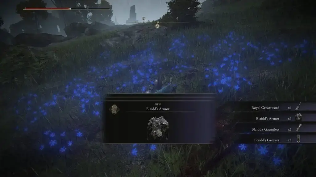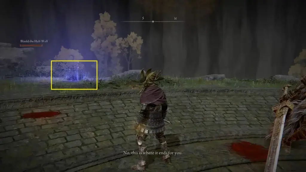 Darriwil 은 아래 그림과 같이 빛나는 푸른 빛으로 나타납니다. Darriwil을 처치 하면 Bloodhound's Fang Curved Greatsword 를 얻을 수 있습니다 . 전투 후 Blaidd 에게 말을 걸면 Somber Smithing Stone[2]을 줍니다. 그는 또한 Raya Lucaria 에서 대장장이를 만나서 Blaidd 가 당신을 보냈다고 말할 것입니다 .