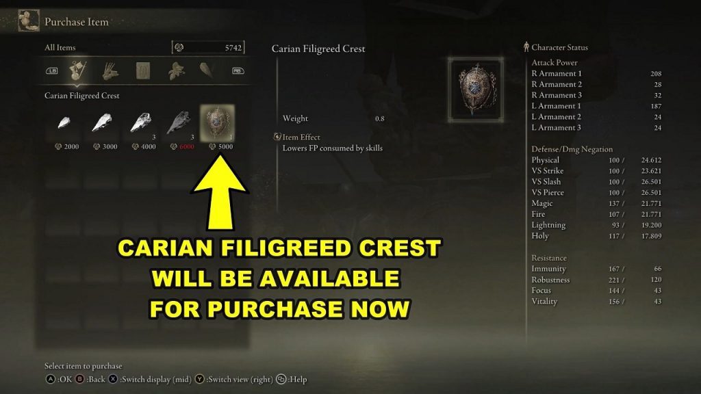 "Blidd sent me" 옵션이 표시될 때까지 그와 계속 대화하십시오. 이제 Falian Filigreed Crest 도 5000 Runes에 구매할 수 있습니다.