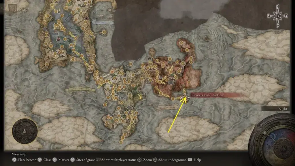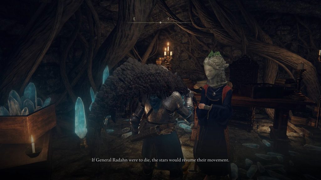 아래 그림과 같이 Ranni's Rise 상단으로 이동 하여 Witch Ranni와 대화하십시오. 그녀는 Blaidd의 도움을 받아 영원한 도시인 Nokron의 숨겨진 보물을 찾으라고 말할 것입니다.