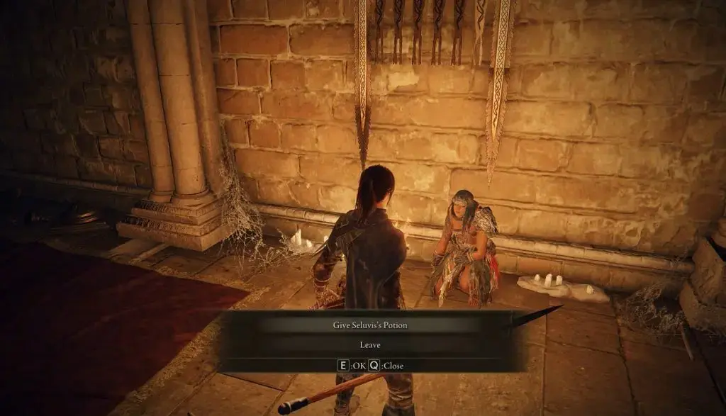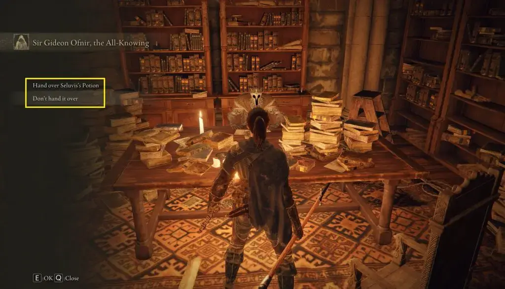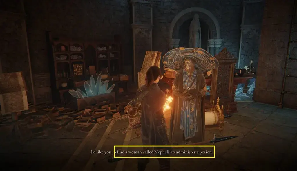 이전 기사에서 언급한 위치에서 Nepheli를 찾아 물약을 제공합니다. 여기서 당신은 그녀에게 물약을 주지 않고 떠날 수 있는 옵션을 얻게 될 것입니다. 탈퇴를 선택하면 퀘스트가 더 이상 진행되지 않습니다. 물약을 Gideon Ofnir 경에게 건네거나 Nepheli에게 주어야 합니다. 네펠리에게 물약을 주면 그녀는 그것을 마시고 움직이지 않을 것입니다.