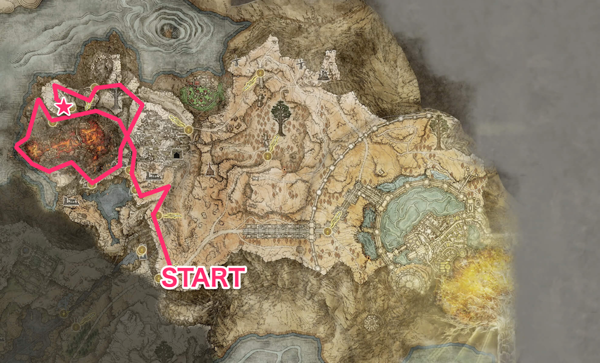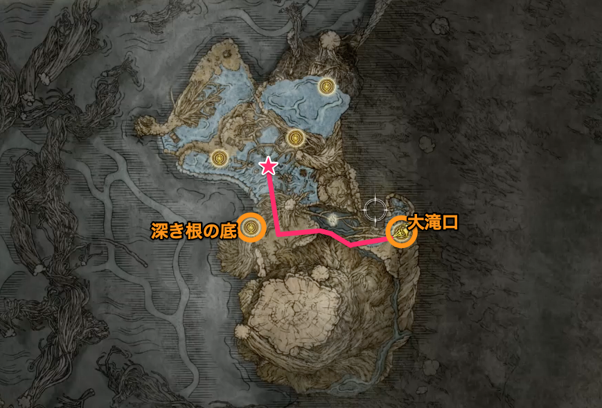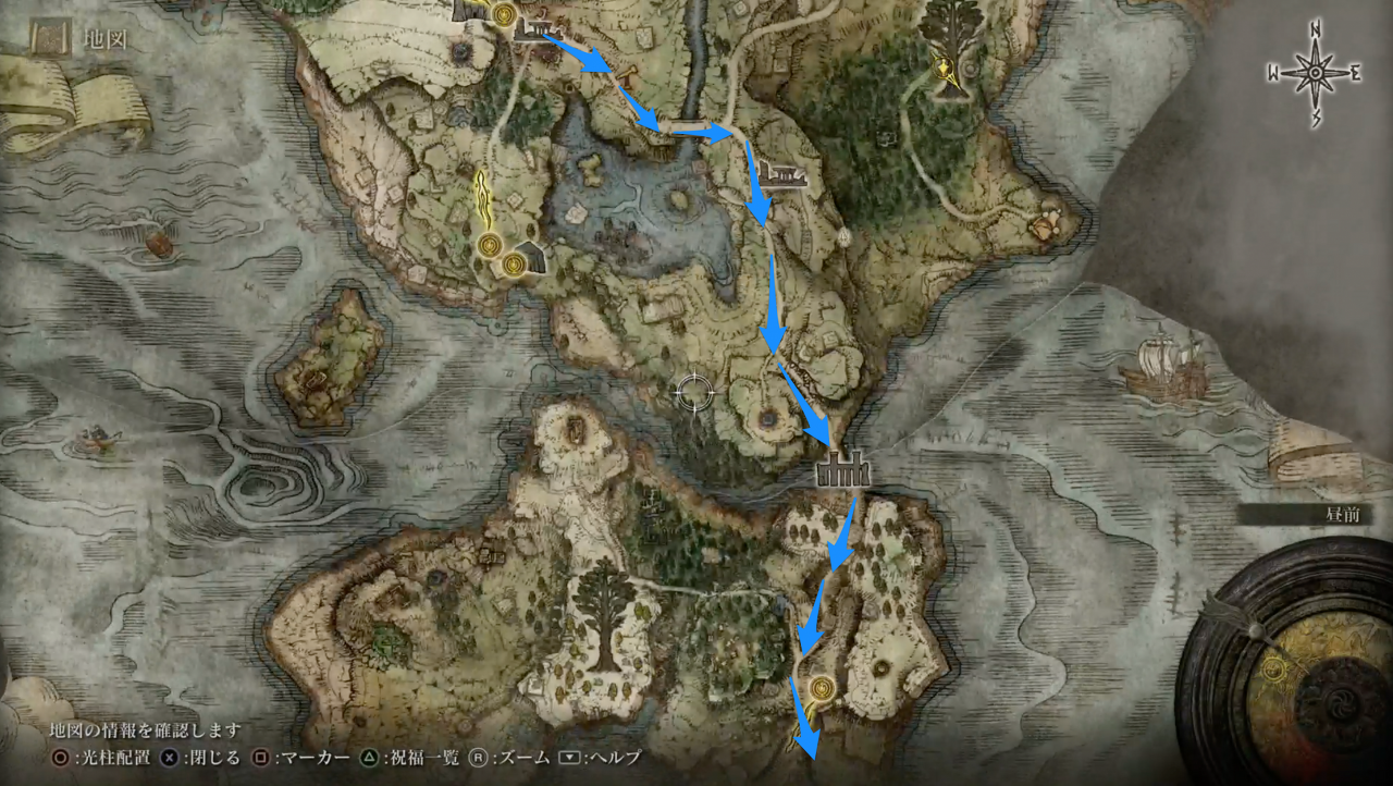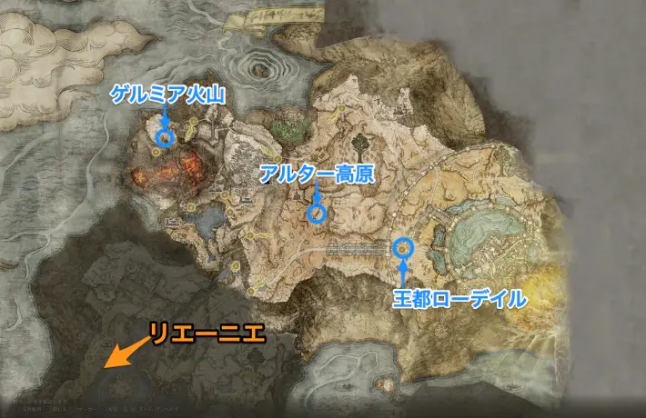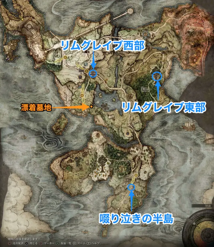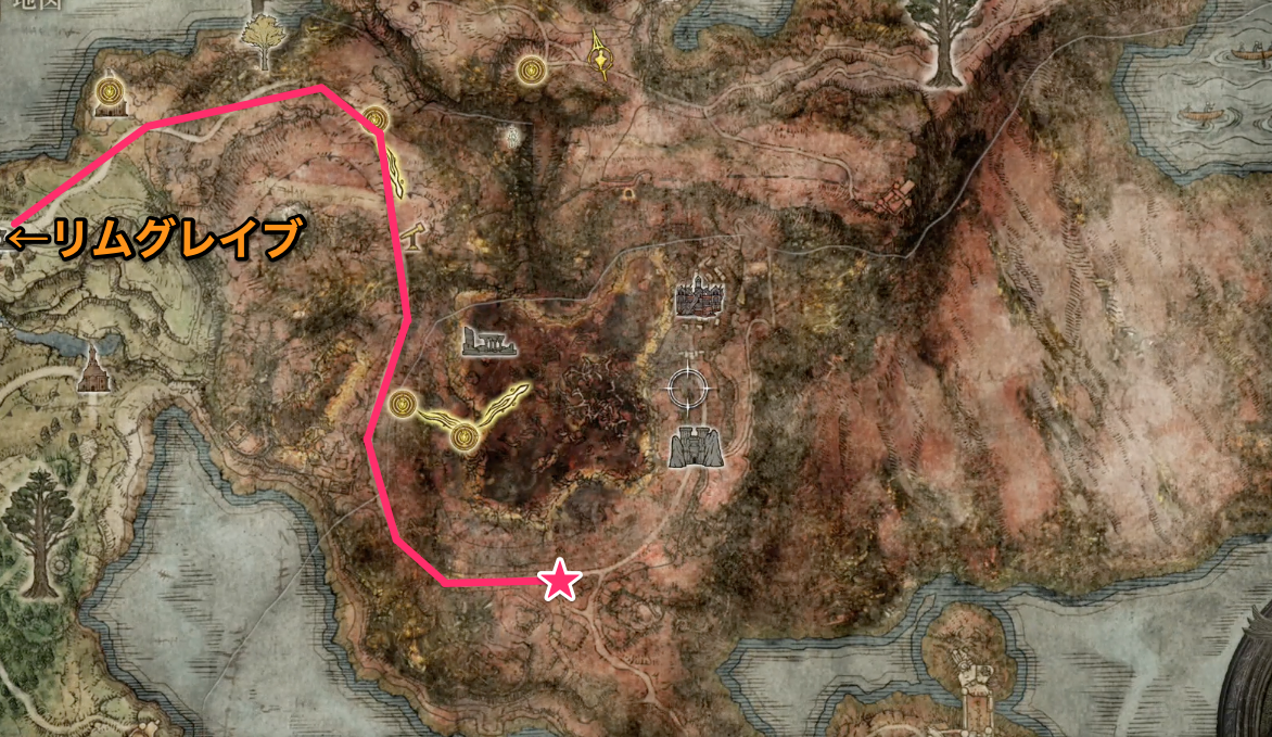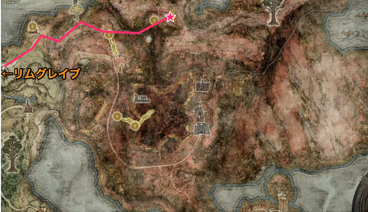 에리어에서 말하면, 「시후라 강의 우물」의 근처. 헤매어 버린 경우는, 림 그레이브 서부의 맵을 먼저 취득해, 하얀 큰 길을 표지로 해 나가자.