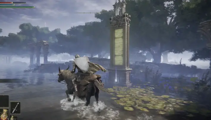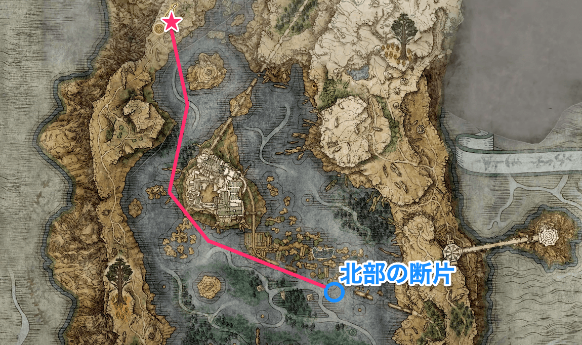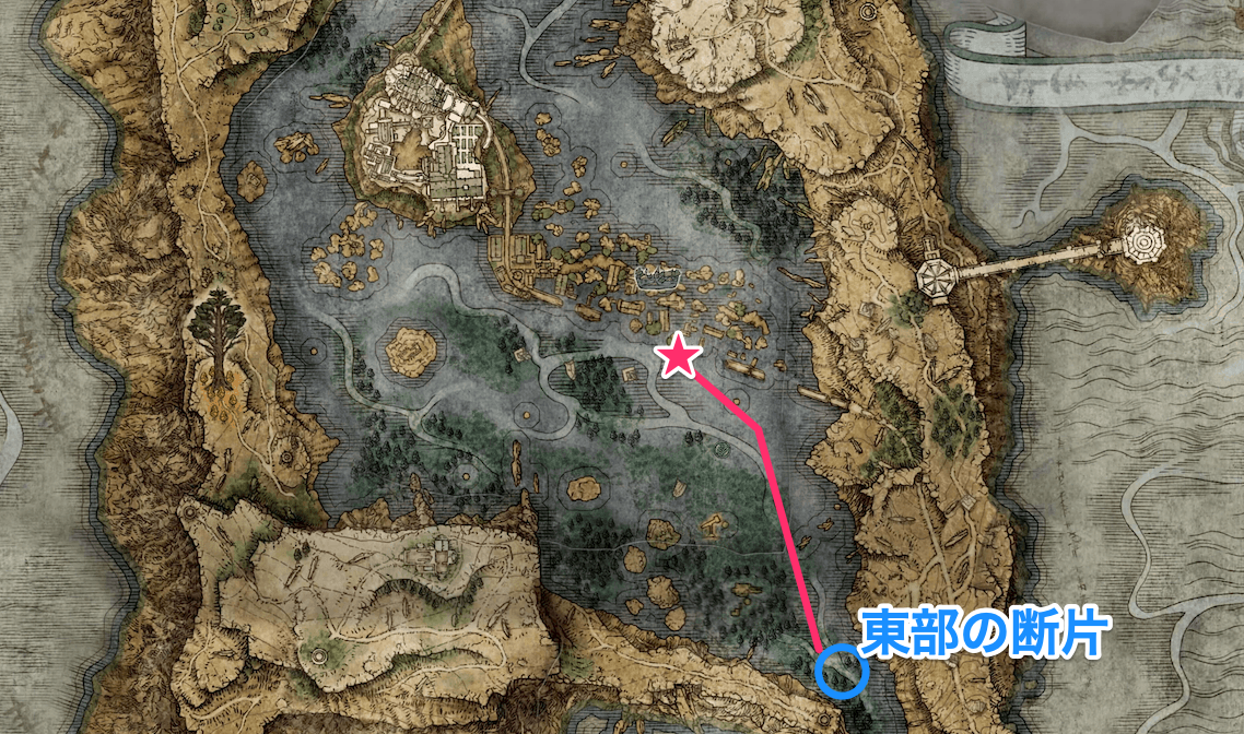 림 그레이브 서부에서 동쪽으로 향한 다리의 끝을 남방면으로 가면 나아가면 반도에 도착한다. 그대로 길 나름대로 남쪽으로 나아가면 축복 '몽의 성벽 앞'이 보인다. 이것을 더 남하한 장소에 지도 단편의 비석이 있다.