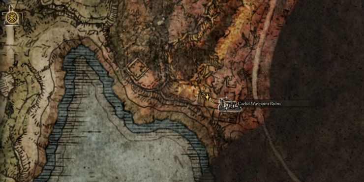 여기에서 탈것을 소환하거나 도보로 여행을 하고 위 그림과 같이 Caelid Waypoint Ruins 를 찾을 때까지 남서쪽 으로 여행하십시오 . 이 여정은 낮은 수준에서 위험할 수 있으므로 전투를 완전히 피하고 시도하십시오.