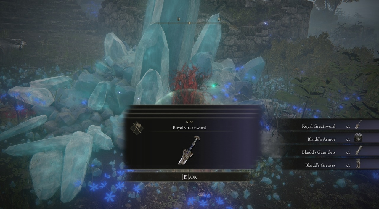 그를 물리치면 Blaidd's Armor, Gauntlets, Greaves가 주어집니다. 추가 보너스로 그의 무기인 Royal Greatsword도 받게 됩니다.