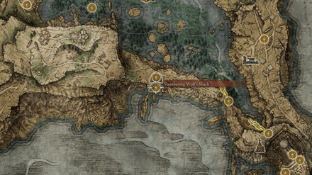 Latenna 는 Liurnia of the Lakes 의 Slumbering Wolf's Shack 바로 앞에서 쉬고 있습니다 . 이 지역에 접근하려면 호숫가 수정 동굴 던전을 클리어해야 합니다.