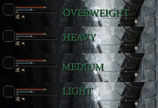 장비 부하에는 4가지 다른 임계값이 있습니다: 경량, 중형, 중량 및 과부하. 이 임계값은 보유한 롤과 스태미나 재생 속도를 결정합니다. 이러한 임계값이 모두 중요하기 때문에 원하는 장비 부하 임계값 미만으로 유지하면서 가장 무거운(가장 보호적인) 갑옷을 장착하고 싶습니다.