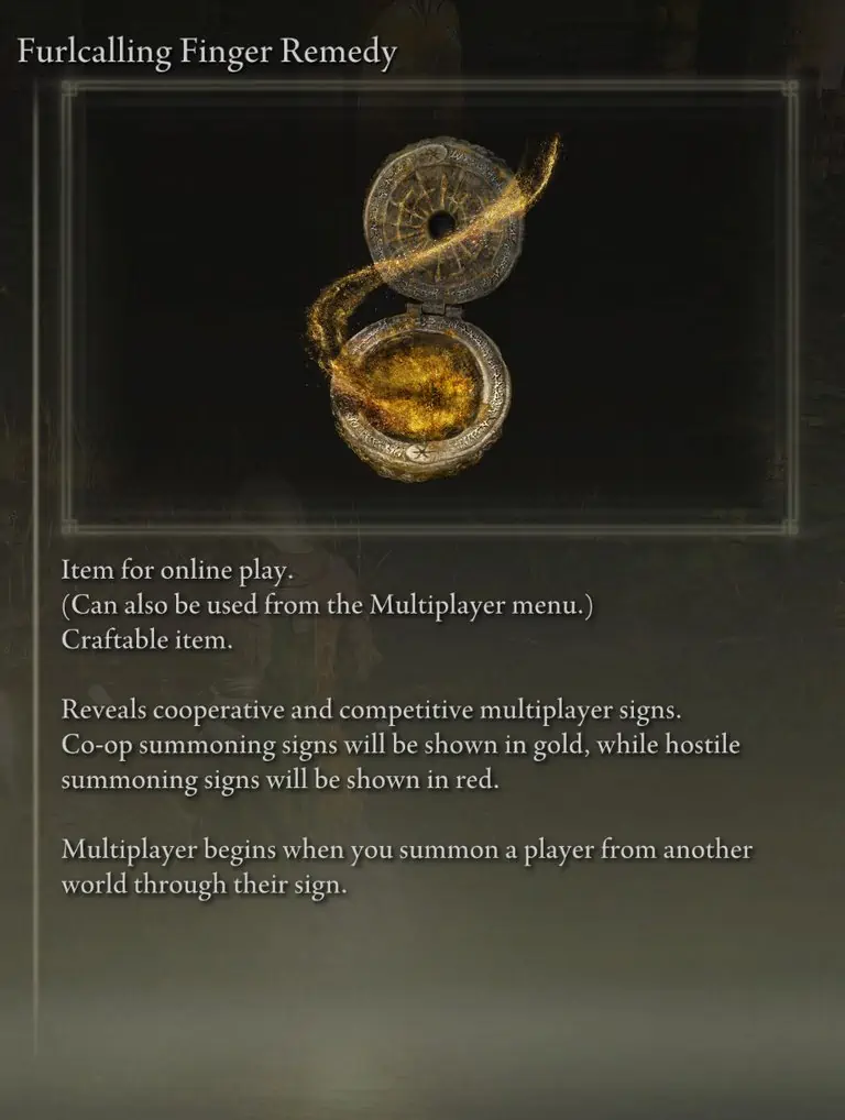 플레이어를 당신의 세계에 참여시키거나 당신이 그들의 세계에 합류함으로써 플레이어와 직접 상호작용할 수도 있습니다. Furcalling Finger Remedy 아이템을 사용하면 패배할 때까지 지속되는 버프를 얻습니다. 협동 및 PvP 소환 신호를 나타내지만, 당신은 또한 당신의 의지에 반하여 무작위로 침략당할 수도 있습니다.
