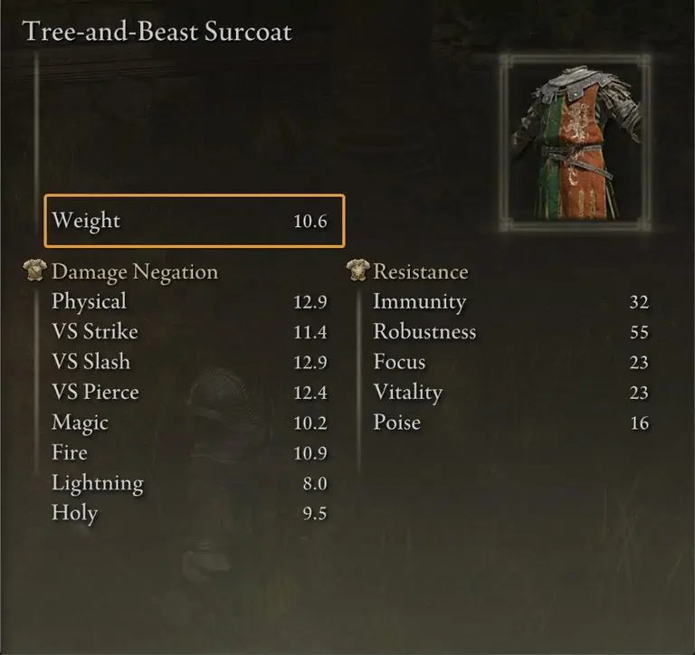 다른 항목에는 다른 무게가 있습니다. From Software(개발자)는 이 장비 로드 시스템을 사용하여 캐릭터가 더 현실적이고 물리적으로 느껴지도록 하므로 더 무거운 갑옷과 무장(예: 더 큰 검이나 방패)은 더 가벼운 갑옷과 무장보다 더 무겁습니다. 추가로 장비한 무기도 장비 부하에 포함되므로 현실적으로 사용할 수 있는 장비를 더 이상 장비하지 마십시오. 통계 페이지에서 각 항목의 무게를 확인할 수 있습니다.