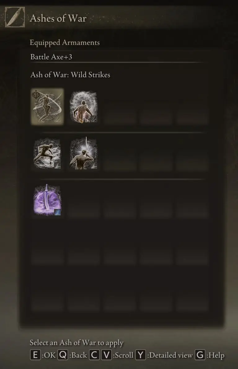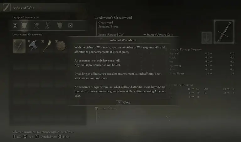 각 Ash of War는 적용할 수 있는 항목을 알려주며 특정 무장을 수정할 때 해당 특정 무장에 적용할 수 있는 Ashes of War만 표시됩니다.