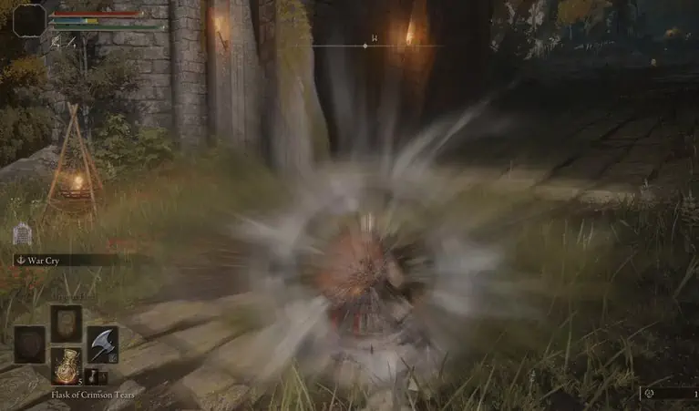 Ash of War와 스킬 "War Cry"를 도끼로 사용하면서 두 손으로 사용하는 예.