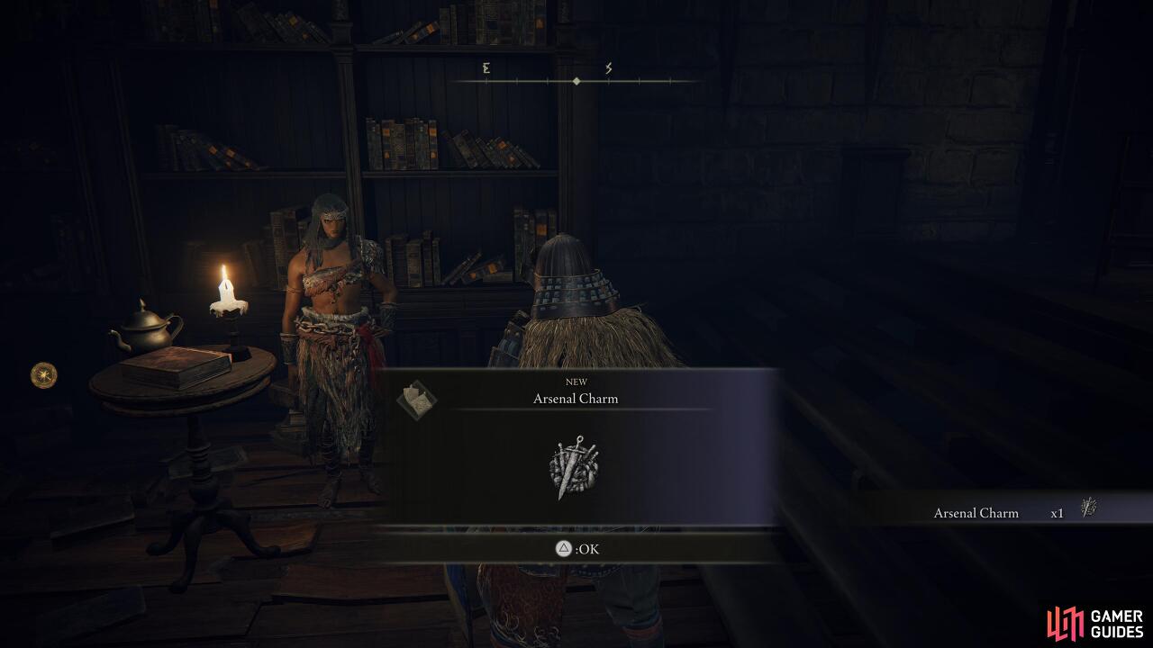 Nepheli Loux는 Roundtable Hold(왼쪽)의 Gideons 방 바로 바깥에서 찾을 수 있으며 여기에서 Arsenal Charm을 넘겨줄 것입니다. (오른쪽)