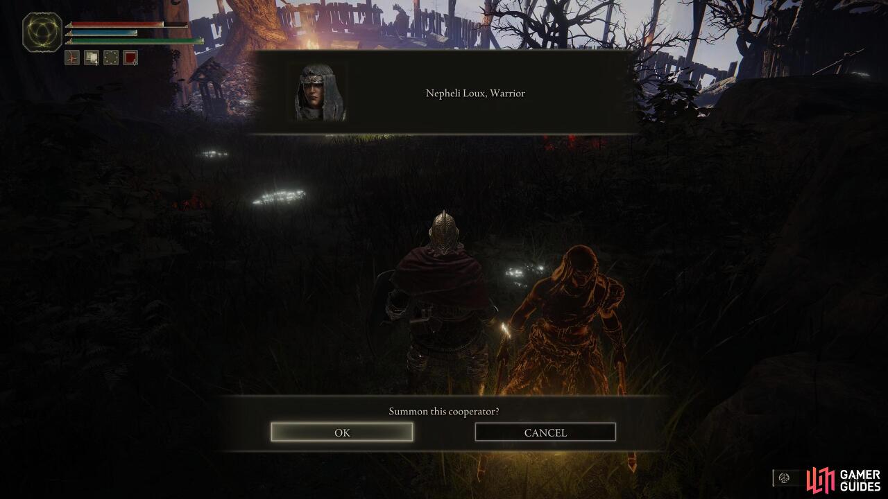 Nepheli와의 다음 만남은 Liurnia 남서부의 Albinaurics 마을에서 열립니다. Albinaurics Site of Grace 의 마을 에서 큰 다리 아래로 가면 그녀가 무릎을 꿇고 있는 것을 볼 수 있습니다. 그녀와 대화하고 그녀의 대화 옵션을 소진한 후 그녀의 뒤와 다리를 건너는 길로 향하십시오. 여기 앞에 화덕 근처에 보스, Omenkiller 가 있지만 잘 보면 왼쪽에 Nepheli의 금 소환 표시 또는 여기 큰 바위를 찾을 수 있습니다. 그녀를 소환하고 오멘킬러 를 처치 하여 그녀의 퀘스트의 이 단계를 완료하십시오.