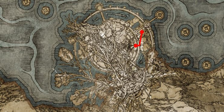 이 부적은 또한 Miquella의 Haligtree로의 여행이 필요하지만, 이번에는 플레이어가 Drainage Channel Site of Grace에서 시작해야 합니다. 팬들은 Elden Ring 의 이 사이트 오브 그레이스가 있는 방에서 동쪽으로 향해야 하며 , 선반에서 떨어지기 전에 멈춰야 합니다. 그런 다음 플레이어는 왼쪽으로 돌아서 앞에 있는 나무 뿌리로 점프해야 합니다.