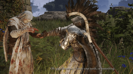 "오, 그래... 변질됐어, 우리? 엘든 링을 위해 사이의 땅으로 가자, 응? 당연하지. 부끄럽지 않아. 하지만 운이 좋지 않아 유감이야. 넌 무녀야 . 비트 플레이어, 룬의 힘과 완전히 분리되었습니다. 아무데나 가서 도랑에서 죽어도 무방합니다."
