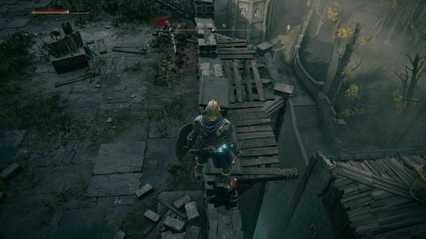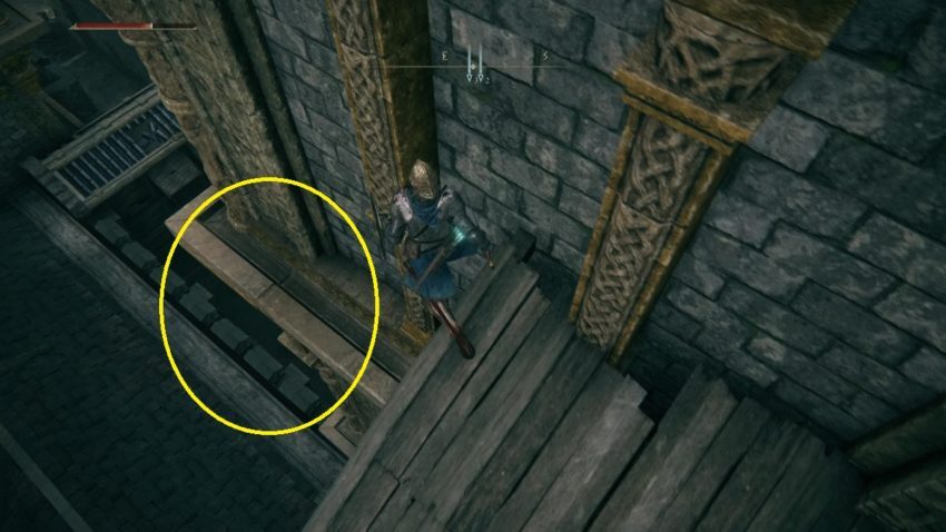 Talisman을 얻으려면 Rampart Tower Site of Grace로 빠르게 이동하고 Castle Guard 적이 여러 명 있는 발코니 섹션을 향해 최상층으로 가십시오. 발코니 입구의 왼쪽에서 경비원 중 한 명이 모래주머니 더미 근처에서 벽에 기대어 쉬고 있는 것을 볼 수 있습니다. 그것을 타고 난간을 조심스럽게 걷고 왼쪽을보고 나무 플랫폼으로 뛰어 내립니다. 아래에 있는 다른 나무 플랫폼으로 뛰어내려 벽을 껴안으면서 벽에서 튀어나온 좁은 선반 위로 내려와야 합니다.