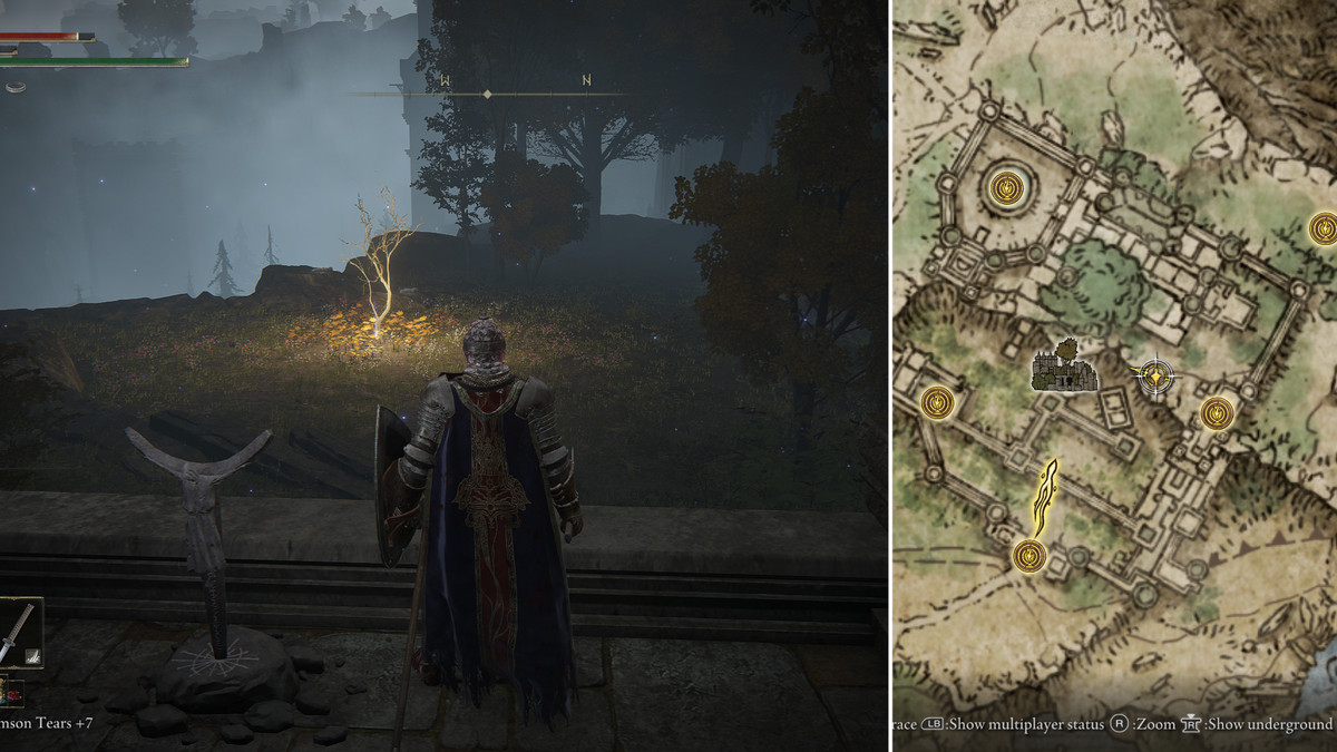 Gatefront Ruins 에서 Stormveil Castle 방향으로 북서쪽 으로 가면 Stormgate 를 통과 하게 됩니다 . 반인간과 트롤을 제거하면 언덕을 계속 올라갈 수 있습니다. 도로가 오른쪽으로 구부러지면 오른쪽에 빛나는 나무가 있는지 살펴보십시오. 이 황금 씨앗 이 그 기반이 될 것입니다.