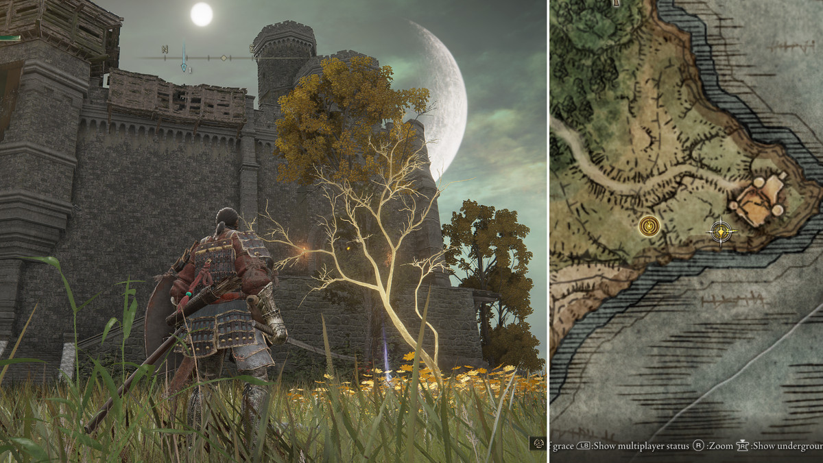 캐슬 몬 리프트( Castle Morne Lift )와 램파트( Rampart) 사이트 사이의 중간쯤에 (대략) 동서로 이어지는 낮은 돌담이 있습니다. 성벽이 있는 고원의 남쪽에서 유적을 찾으십시오. 폐허의 바로 남쪽에는 또 다른 빛나는 나무와 그 기지에 황금 씨앗 이 있습니다( Weeping Plateau 지도 조각 비석 에서 약간 남서쪽에 있습니다 ).