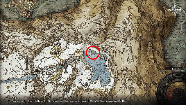 Mountaintops of the Giants에서 Seppuku Ash of War로의 여행을 시작하십시오. 거인의 산꼭대기의 북서쪽 끝 부분에 얼어붙은 호수가 있습니다 . Leyndell에서 징조의 왕 Morgott를 물리친 후 받는 Rold 메달리온으로만 도달할 수 있습니다. 사슬과 바위 다리를 가로질러 Rold의 Grand Lift를 올라가고 큰 얼어붙은 호수의 최북단 부분 에는 보이지 않는 Teardrop Scarab이 있습니다.