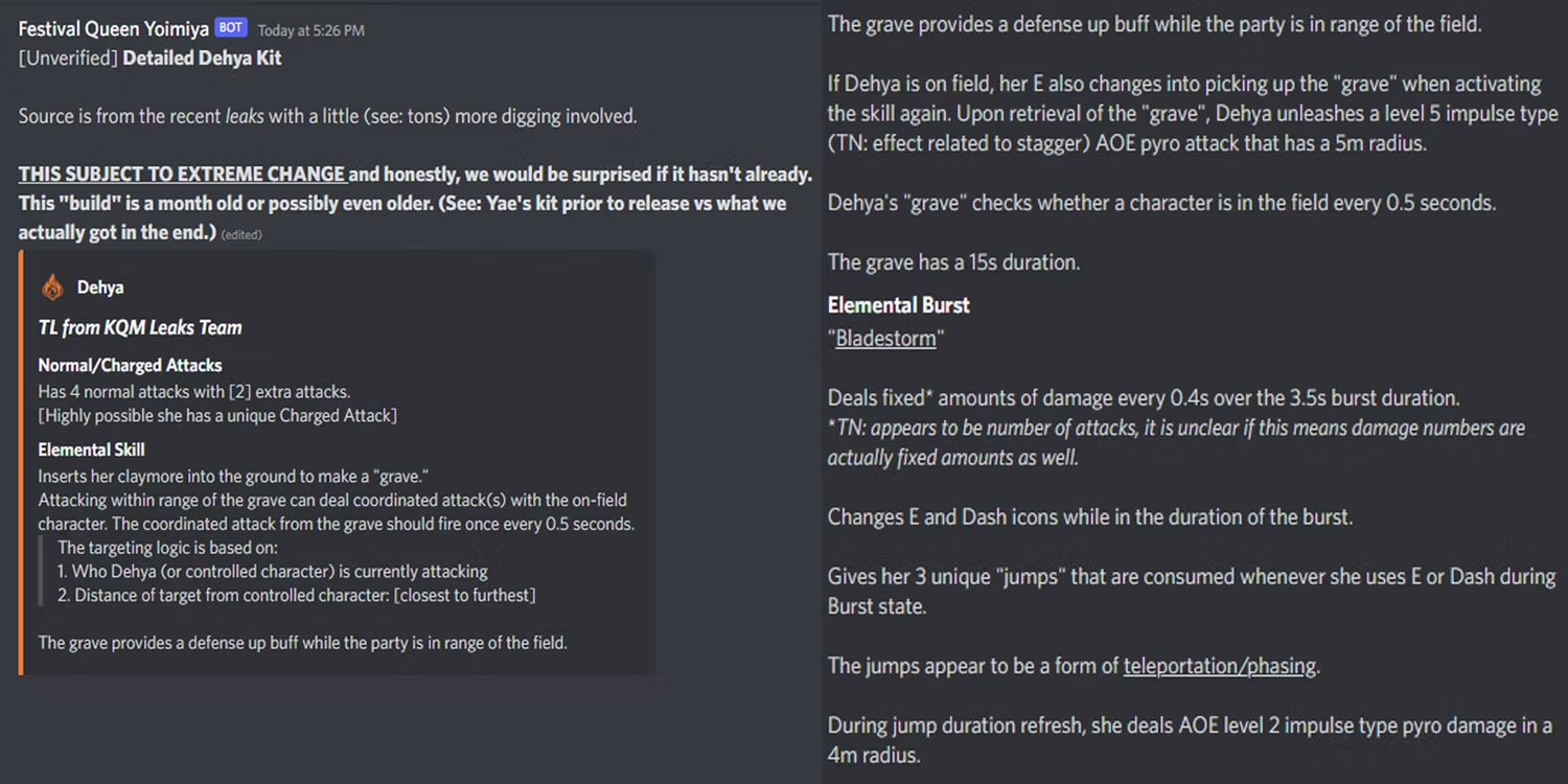 새로운 Gesnhin Impact 누출은 Dehya의 원소 기술 및 원소 폭발에 대한 효과를 포함하여 Dehya의 향후 키트에 대한 자세한 정보를 제공했습니다. 누출에 따르면 그녀의 원소 기술은 추가 피해를 입히고 파이로 요소를 적용하는 효과 영역을 제공하는 클레이모어를 땅에 배치하게 합니다. 버프가 시간 초과되면 Dehya는 최근 Genshin Impact 트레일러에서 클레이모어로 확인 된 그녀의 무기를 회수 하여 큰 반경 내에서 추가 파이로 피해를 입힐 수 있습니다. 그녀의 원소 폭발은 3.5초의 폭발 지속 시간 동안 0.4초마다 고정된 양의 피해를 입힐 수 있기 때문에 훨씬 더 복잡해 보입니다.