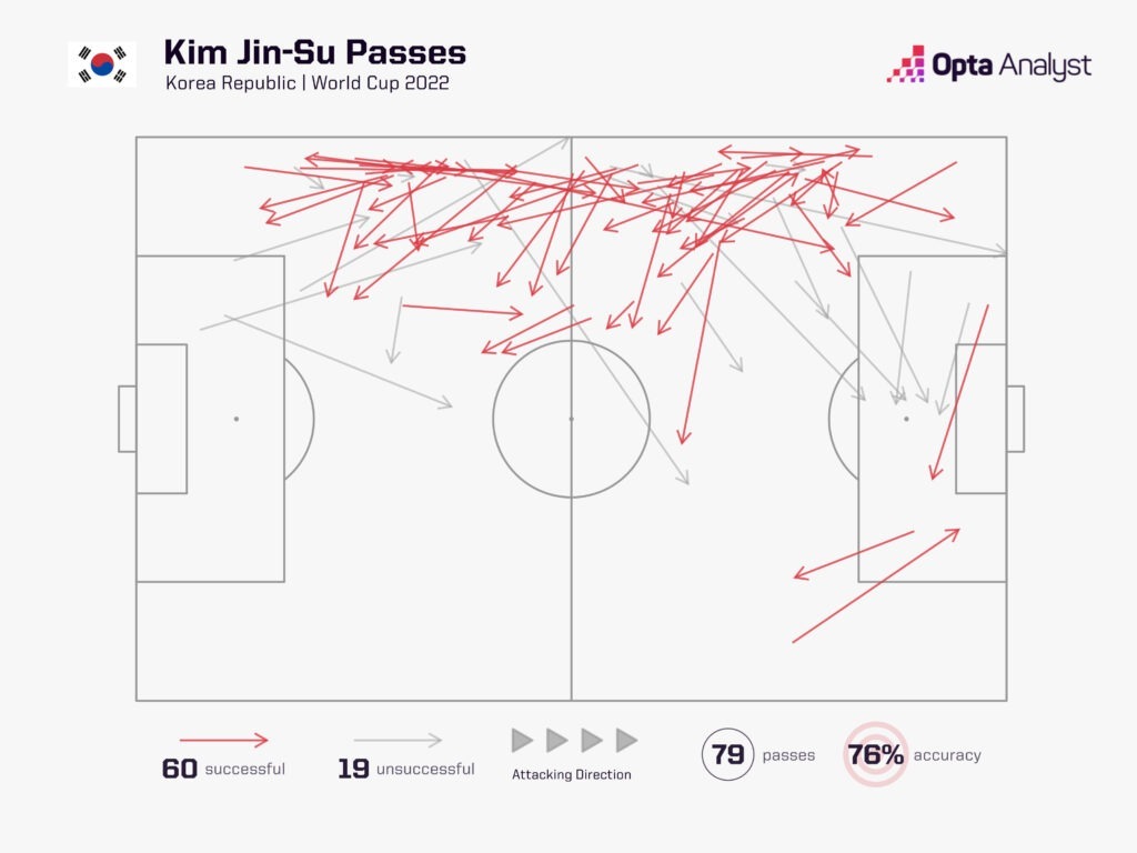 이번 대회에서 한국의 주요 공격 경로 중 하나는 왼쪽 측면으로 내려갔고, 김진수의 질 좋은 딜리버리가 진짜 특징이었다.