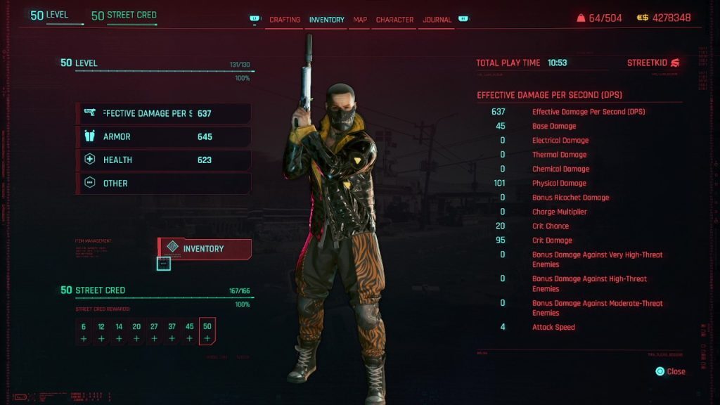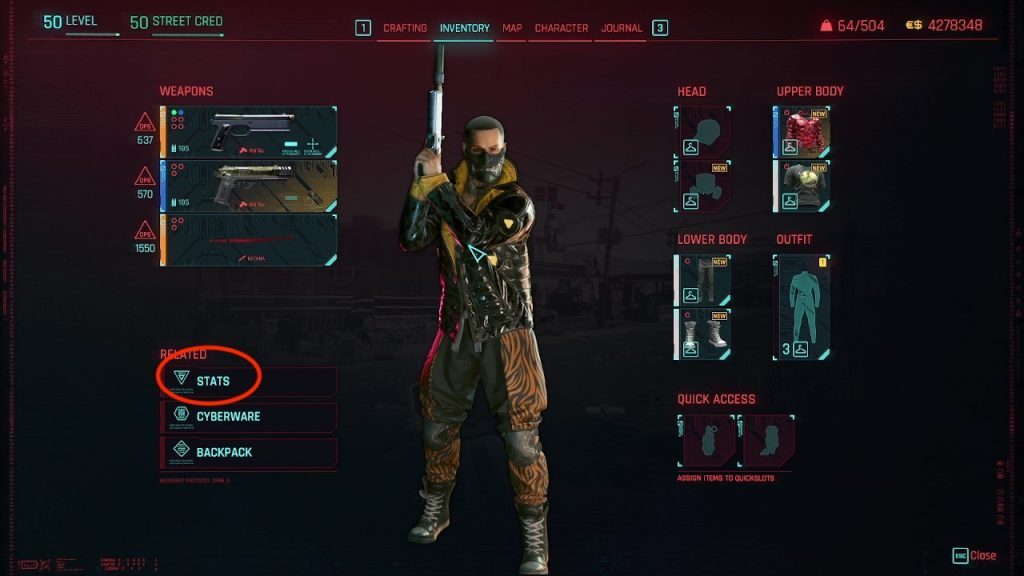 - Cyberware 옆에는 통계 탭이 있습니다. 여기에서 레벨에 따라 통계와 관련된 피해를 볼 수 있습니다.