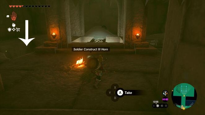 리프트 룸으로 돌아갑니다. 여기 계단 아래에서 떨어진 바위 아래에서 돌풍을 볼 수 있습니다. Ultrahand를 사용하여 이를 제거한 다음 돌풍을 사용하여 방 맨 위까지 활공합니다. 여기서 솔저 컨스트럭트를 처치하세요.