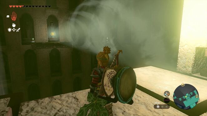 빔으로 패널을 치면 그 앞에 스위치가 나타납니다. 돌풍을 이용해 스위치 방향(남동쪽)으로 날아올라 벽을 움켜쥔다. 스위치가 있는 난간까지 올라가 스위치를 눌러 안으로 계속 들어갑니다.