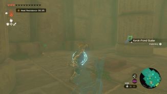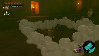 이 첫 번째 방에서는 여러 개의 모래 더미를 볼 수 있습니다. 여기 벽에서 Korok-Frond Guster를 찾으십시오 . 이것은 돌풍을 일으키는 데 사용할 수 있는 근접 무기입니다. 이것은 모래 더미를 옮기는 데 적합합니다! Flame Emitter 가 있는 보물 상자 를 위해 오른쪽 벽을 따라 모래 를 날려 버리 세요 . 뒷벽에 가장 가까운 모래 더미를 날려 압력판을 드러냅니다. 이것을 밟으면 다음 방으로 가는 문이 열립니다.