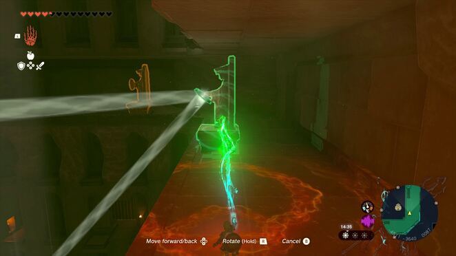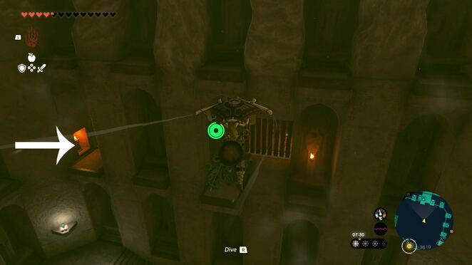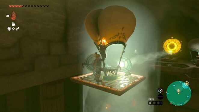 플레이트를 활성화하려면 전면에 거울이 장착된 열기구를 만들어야 합니다. 그런 다음 거울이 플레이트 방향을 향하도록 풍선을 빛의 광선에 넣은 다음 손전등을 사용하여 풍선을 들어 올리려고 합니다. 빔이 판에 닿으면 아래의 문이 열리고 배터리 에 도달할 수 있습니다 . Riju의 번개 공격을 사용하여 전원을 켭니다.