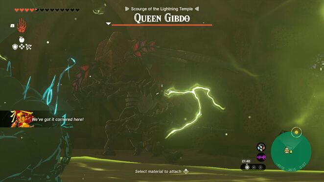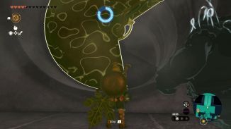 위의 방에 도착하면 벽 중 하나에 4개의 비활성 Gibdo 벌통과 커다란 분홍색 주머니가 보입니다. 분홍색 주머니에 Riju의 조명을 사용하여 장면을 트리거한 후 지역 보스와 싸우게 됩니다.