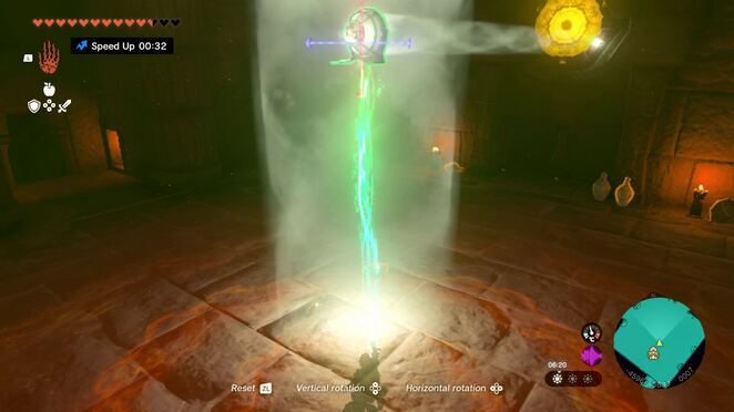 화염 제트로 이어지는 방에는 바닥 중앙에 느슨한 타일이 있습니다. 이것을 타고 작은 더 낮은 지역으로 내려갈 수 있습니다. Electric Keese와 Gerudo Scimitar가 있는 석관이 여기 있지만 그다지 흥미로운 것은 없습니다. 넘어지면 큰 중앙 블록에 서서 Recall을 사용하여 다시 위층으로 올라갑니다.