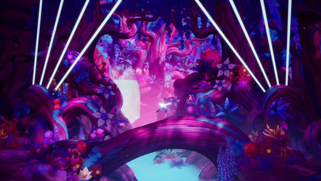 Artful Escape의 가장 큰 하이라이트입니다. 예, 기억에 남는 순간과 함께 매우 감동적인 이야기를 들려주지만 이 모든 것은 게임의 놀라운 프레젠테이션에 의해 전달됩니다. 이 게임의 모든 부분은 색상, 스펙터클, 생명으로 가득 차 있습니다. 동식물로 둘러싸인 외계 행성을 파쇄하고 모든 리프에 역동적으로 반응하는 것은 아름답습니다. 이 타이틀에는 오디오와 비주얼이 미친 정도로 결합된 입이 떡 벌어지는 시퀀스가 있습니다.
