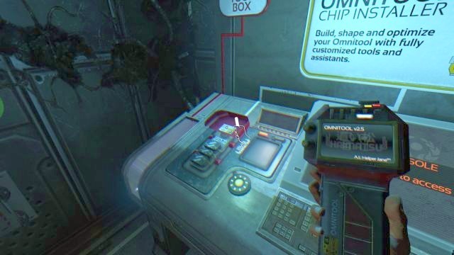 이 역에서의 여정이 시작된 방으로 돌아가십시오. " Omnitool Chip Installer " 라는 터미널로 이동하십시오. 도착 후 Omnitool을 터미널 왼쪽의 특수 슬롯에 넣으십시오. 이것은 신용 카드 리더기와 유사합니다. 시스템이 부팅될 때까지 기다린 다음 터미널을 활성화합니다. "Omnitool" 옵션을 선택한 다음 "Unlock Tool Box" 버튼을 누릅니다. 이제 터미널을 떠나십시오.