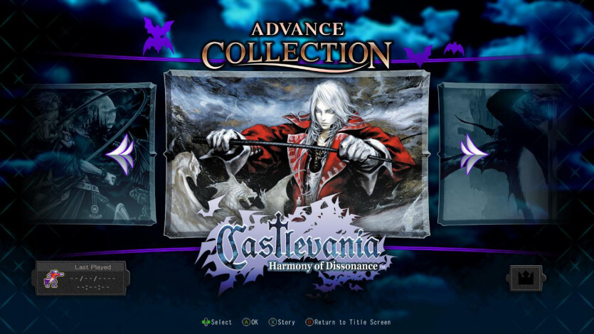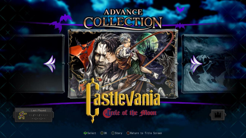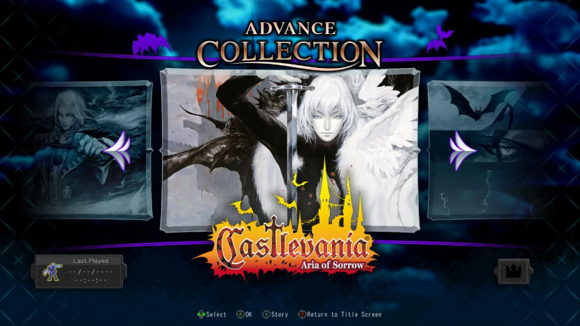 - 컬렉션에는 2001년, 2002년 및 2003년에 출시된 일련의 게임이 포함되어 있습니다. Castlevania: Circle of the Moon , Castlevania: Harmony of Dissonance 및 Castlevania: Aria of Sorrow . 보너스로 추가된 것은 1995년의 또 다른 SNES 타이틀인 Castlevania: Dracula X입니다. 플레이어가 역추적하는 데 도움이 되는 새로운 되감기 기능과 빠른 저장 및 버튼 매핑과 같은 몇 가지 추가 삶의 질을 제공합니다.