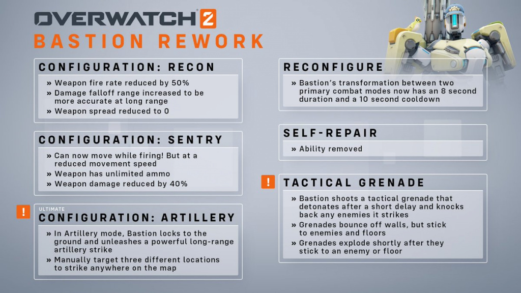 Bastion의 Ultimate도 재작업되어 탱크 구성에 작별을 고하며 지도의 어느 곳에나 배치할 수 있는 3개의 공격이 있는 새로운 포병 모드를 선보입니다. 이 샷은 최대 600의 피해를 주지만 D.Va에 의해 매트릭스화되거나 Genji에 의해 반사될 수 있습니다.