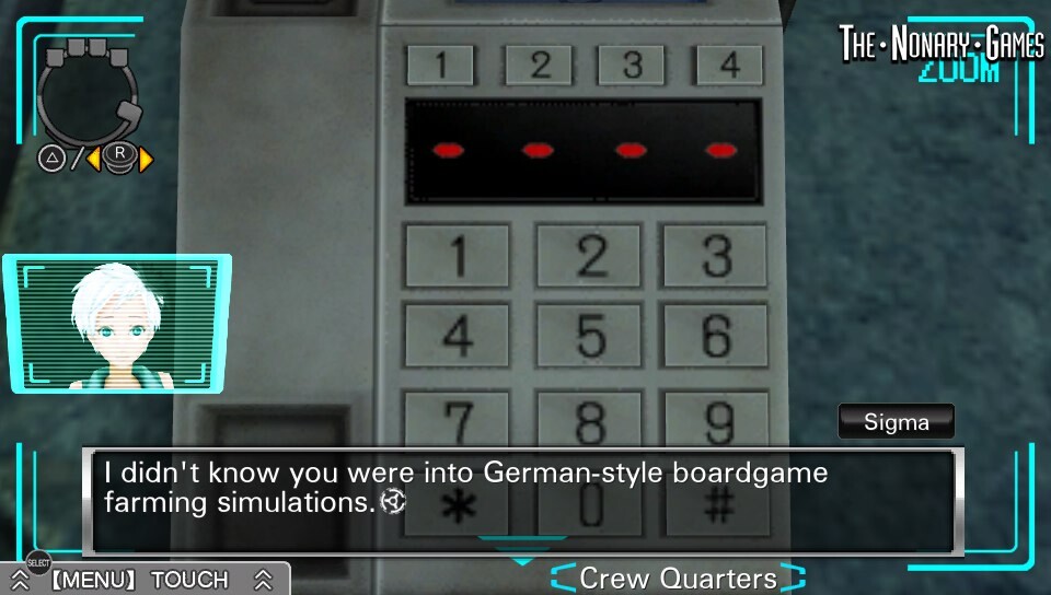 때때로 도덕적 문제가 나타나기는 하지만 노골적인 절단과 살인이 없는 Saw와 같은 흥미로운 설정입니다. 일종의. 보시다시피, 999는 기존 게임보다 퍼즐 요소가 포함된 비주얼 노벨에 가깝습니다. 즉, Junpei로서 스토리에 영향을 미칠 결정을 내릴 수 있는 순간이 몇 분 없다는 의미입니다. 대부분 그냥 읽고 다음 지역(그리고 더 많은 독서)으로 가는 길을 열기 위해 위치의 퍼즐을 푸는 것입니다. 나는 솔직히 이것에 괜찮습니다. 또는 적어도 한때 나는 999를 어드벤처 게임이 아니라 비주얼 노벨로 보는 것을 알고 있었습니다.