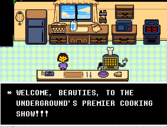 당신만을 위한 요리쇼입니다. 그를 위한 재료를 가져와 테이블 위에 놓습니다. 그는 당신에게 전기톱을 사용하려고 할 것이지만 Alphys가 그를 막을 것입니다. 카운터에서 인간 영혼 대체품을 가져와야 합니다. 캔은 도달할 수 없는 탁자 위의 공중으로 날아오를 것입니다. 그러나 Alphys는 당신이 사용할 제트팩을 가지고 있습니다. 그가 당신에게 던지는 계란, 우유, 밀가루를 피하십시오. 걱정하지 마세요, 당신은 실패할 수 없습니다. 그는 지금 당신을 내버려 둘 것이므로 동쪽으로 계속 가십시오.