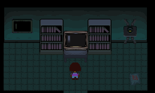 진행할 준비가 되면 연구소 앞 세이브 포인트로 돌아가서 바로 거대한 건물로 들어갑니다. 동쪽으로 이동하여 연구실에 들어갑니다. 내부는 처음에는 다소 어둡고 더 깊이 들어갈 때까지 아무것도 확인할 수 없습니다. 분명히 거기에 당신과 함께 모니터가 있습니까? 결국 작은 괴물이 들어와 당신을 보고 충격을 받습니다. 알피스 박사입니다! 그녀는 왕실 과학자입니다. 그녀는 당신의 여행을 보기 위해 당신이 전에 본 카메라를 배치했습니다. 그녀는 인간을 파괴하도록 프로그래밍된 자신의 로봇 메타톤에 대해 이야기할 것입니다.