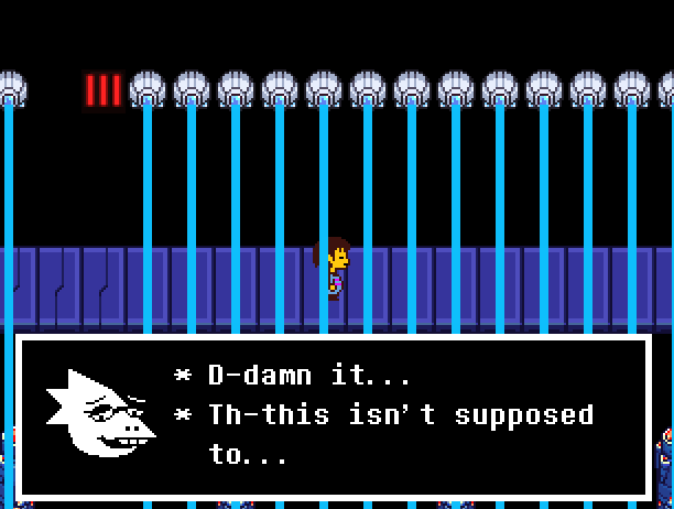 앞으로 다리를 따라 움직이는 많은 레이저를 찾을 수 있습니다. Alphys가 당신을 위해 그것들을 끌 것입니다. 그러나 그들이 다시 켜질 것이기 때문에 조심하십시오. 모든 레이저가 파란색이기 때문에 Alphys가 레이저를 끄도록 한 다음 빠르게 앞으로 달려야 합니다. 그들을 피하기 위해 켜지기 직전에 중지하십시오.