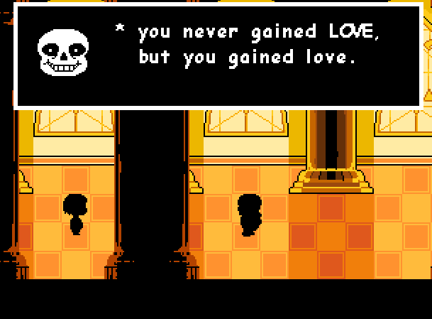 당신을 심판할 시간입니다. Sans는 게임 진행 상황, 특히 몬스터를 죽였는지 여부에 대해 설명합니다. 당신이 이 가이드를 따른다면 그는 당신과 함께 기뻐할 것이고 당신이 앞으로 나아갈 수 있도록 할 것입니다. 그는 EXP와 LOVE 그리고 폭력이 지속되는 방식에 대해 알려줍니다. 하지만 당신은... 당신은 사랑이 아니라 사랑을 얻었습니다. 당신은 친구를 사귀고 도덕에 충실했습니다. 그는 당신에게 두 가지 옵션이 있다고 말합니다. Asgore가 당신을 죽이거나 죽이도록하십시오. 그가 당신을 판단한 후 복도를 계속 내려가십시오.