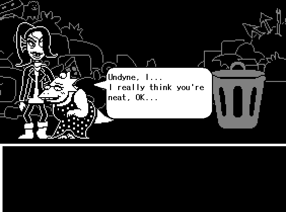 , 그녀가 가장 좋아하는 장소인 쓰레기장을 초대합니다. 언다인이 곧 나타나서 알피스를 숨깁니다. Alphys는 그녀가 Undyne을 좋아하고 그녀와 데이트하는 것을 선호한다는 것을 인정할 것입니다. 그녀의 거짓말은 언다인에게 말하기를 두려워하게 만듭니다.